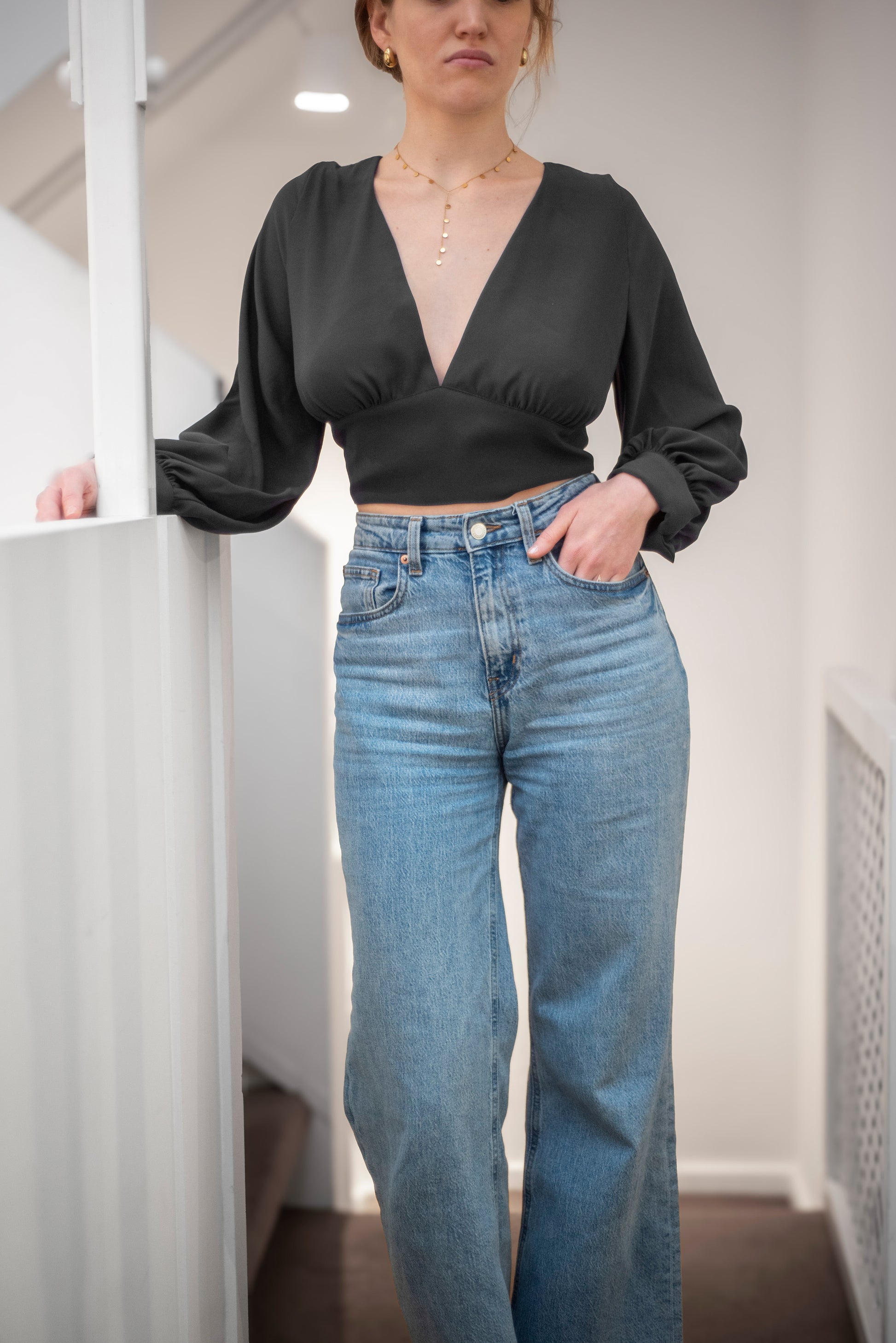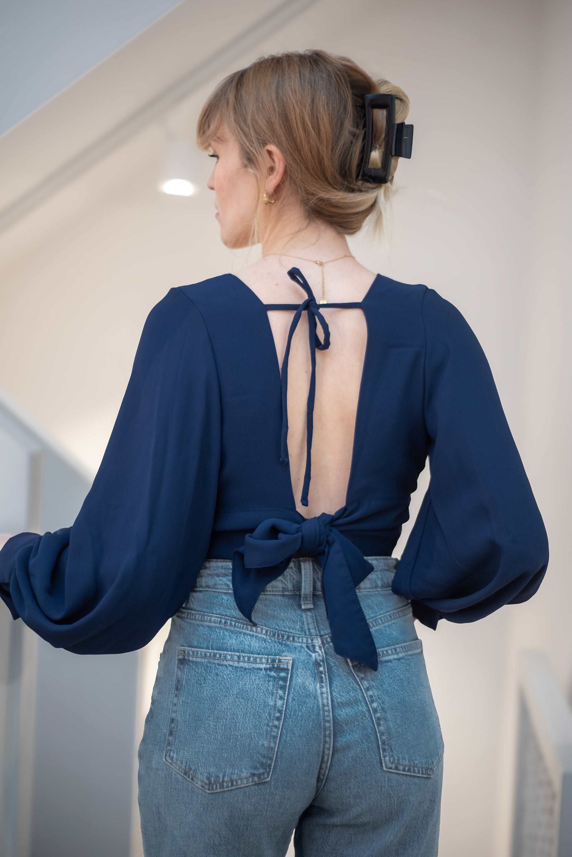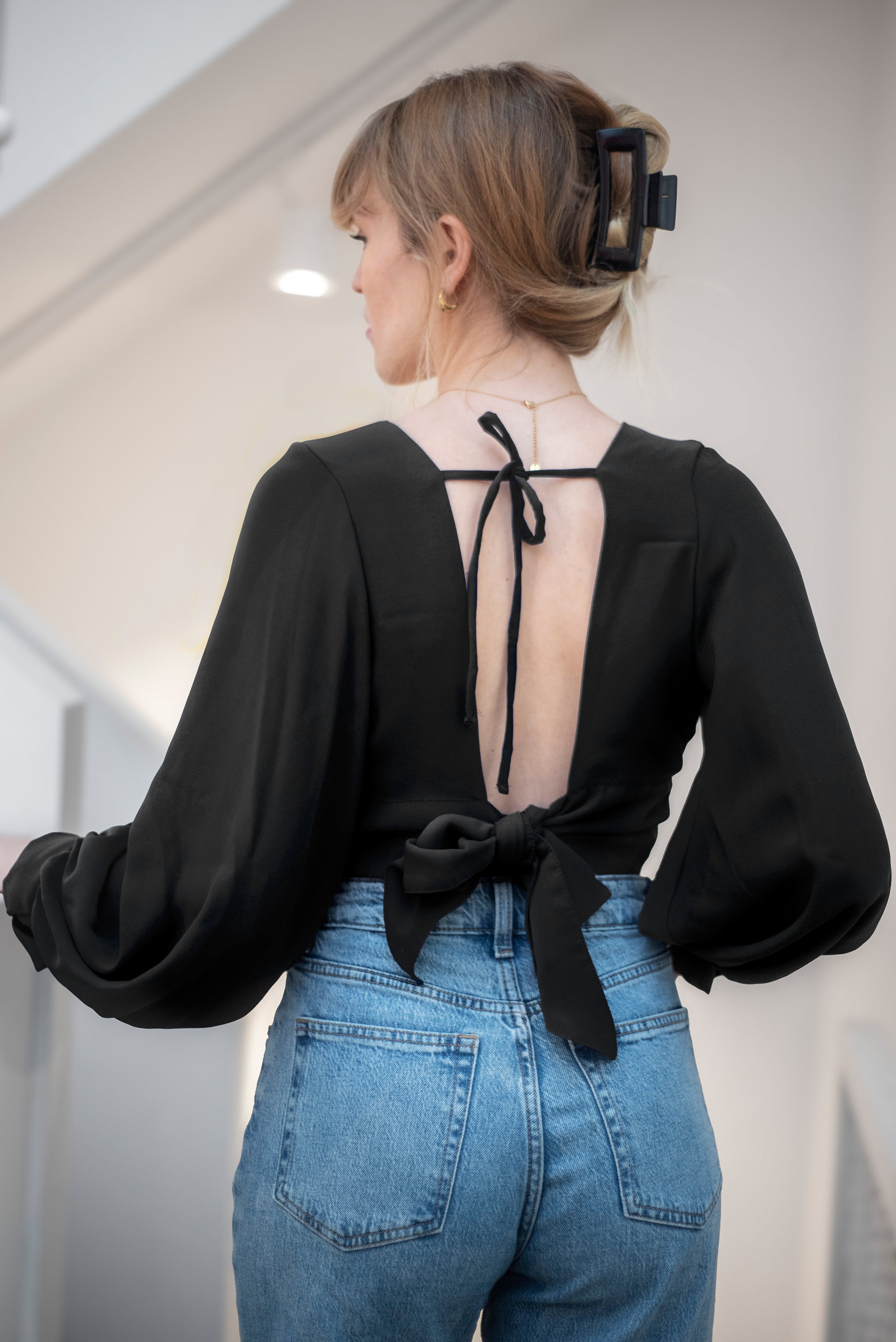 • Pour son dos nu élégant et ses manches bouffantes